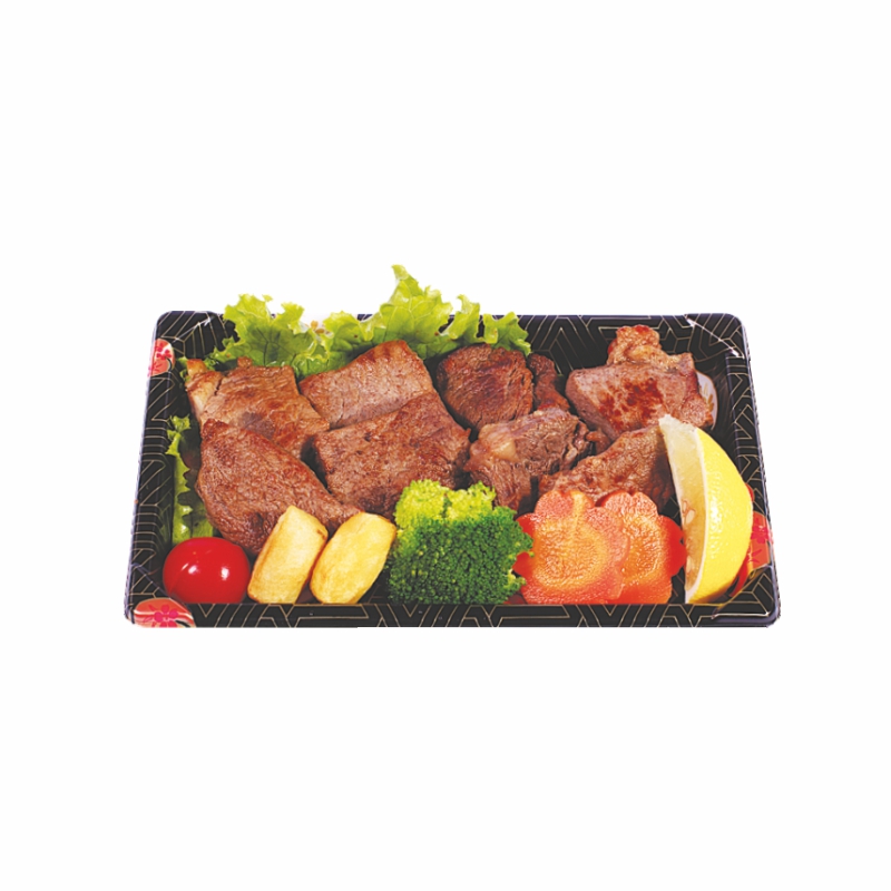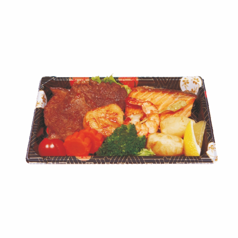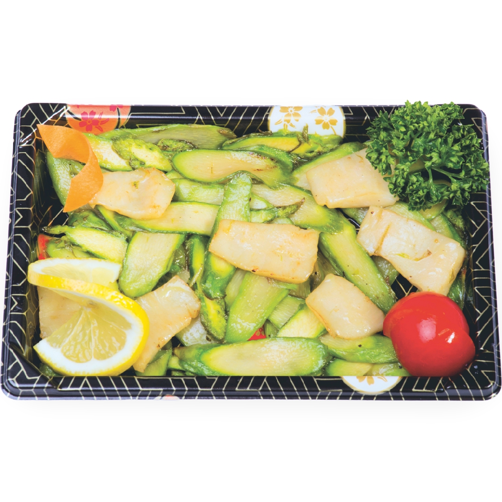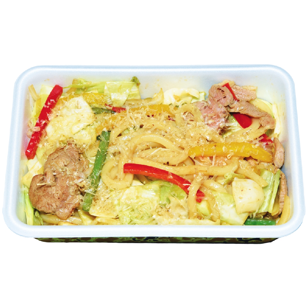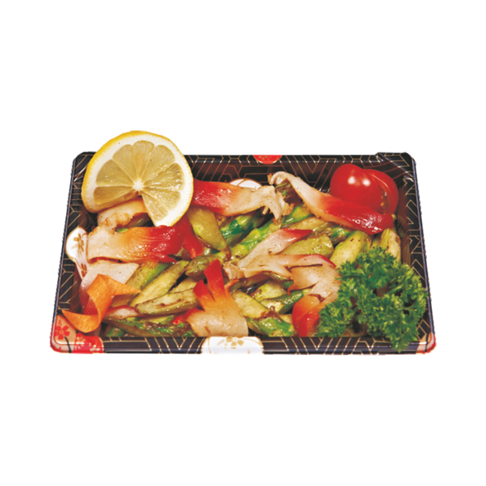 Кусочки свинины, кальмары и креветки с овощами, слегка обжаренные в масле (Японский соус)