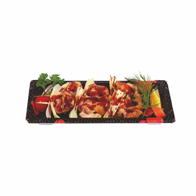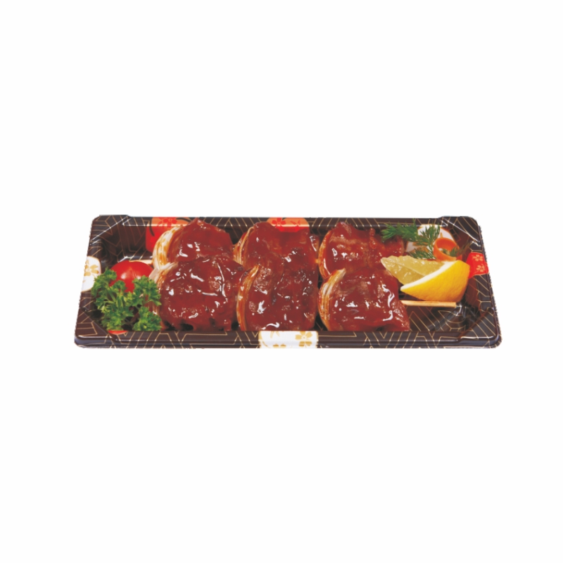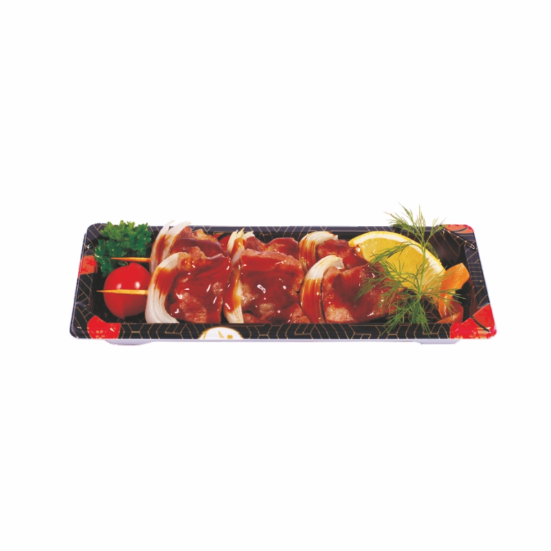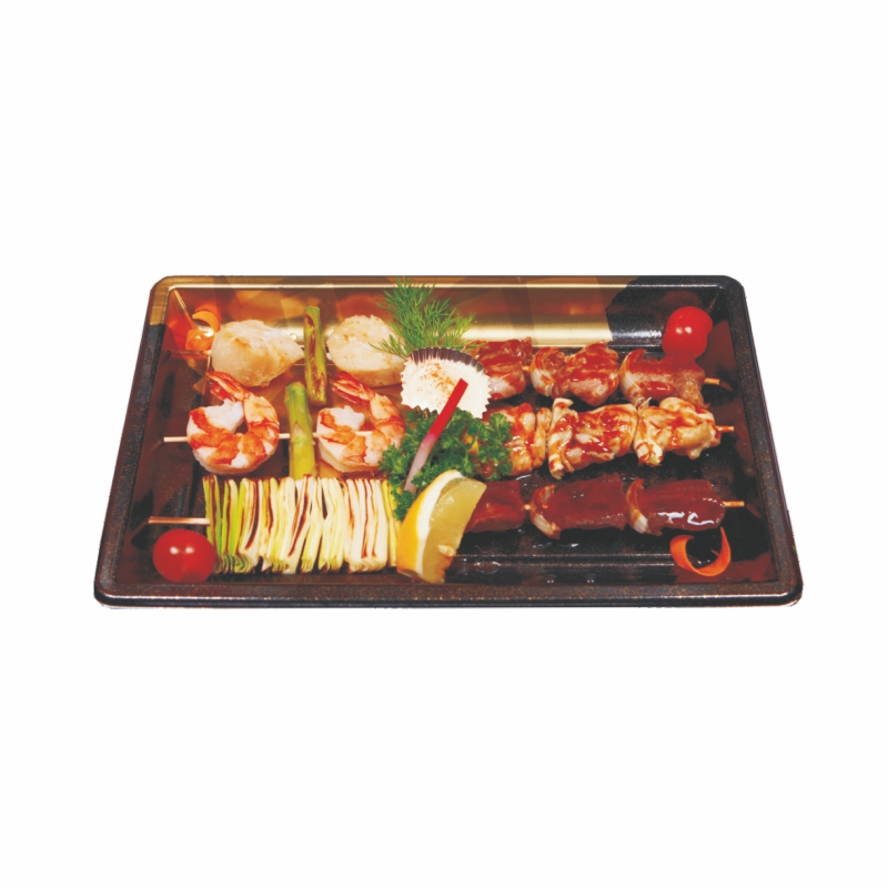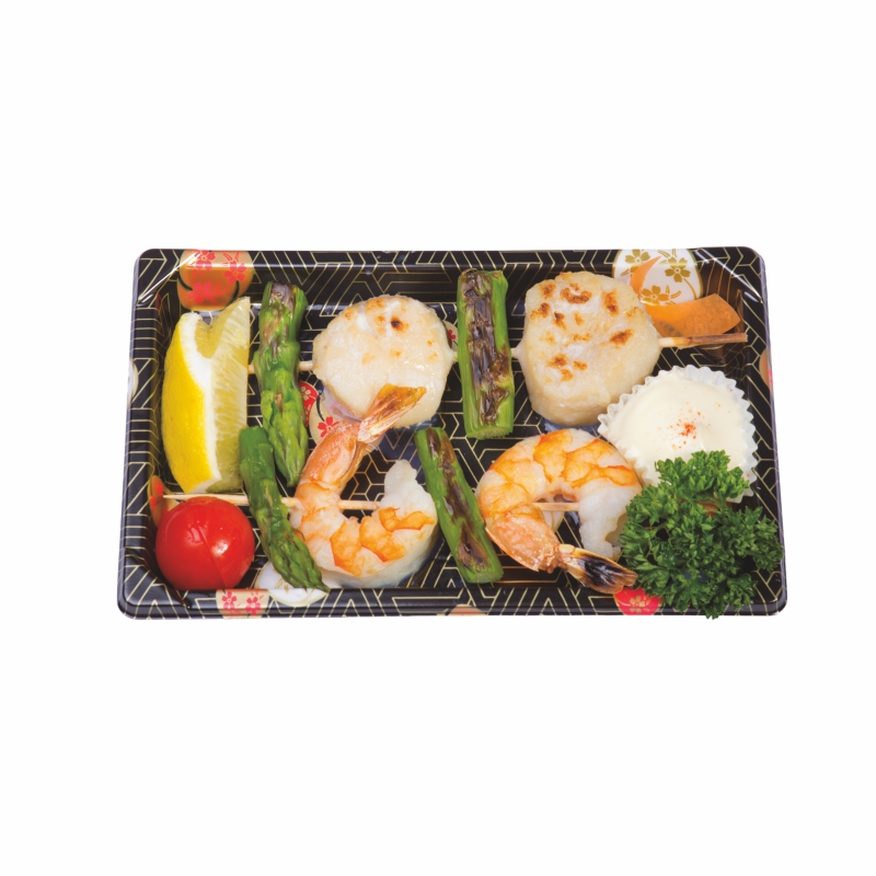 Ассорти японских шашлычков: шашлычки с гребешком и спаржей, креветкой со спаржей, курицей, говядиной, свининой и луком пореем