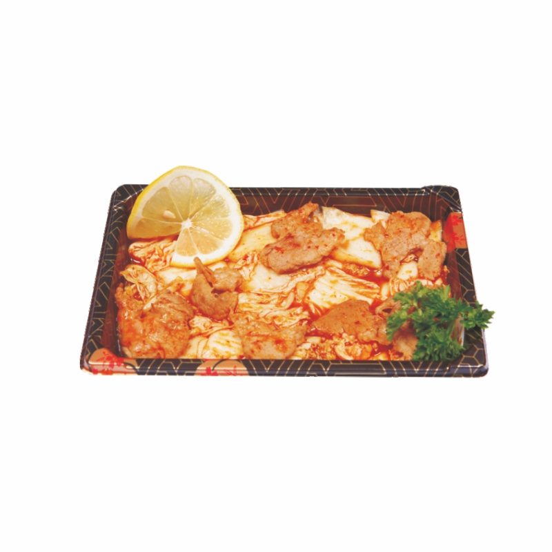 Кусочки свинины, кальмары и креветки с овощами, слегка обжаренные в масле (Острый соус)