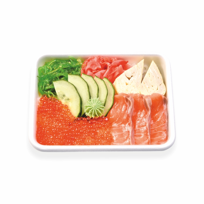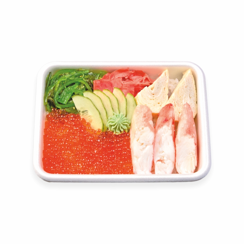 Ломтики свежего лосося, икра лосося, салат чуука, маринованный имбирь, огурец и японский омлет, выложенные на суси-рис