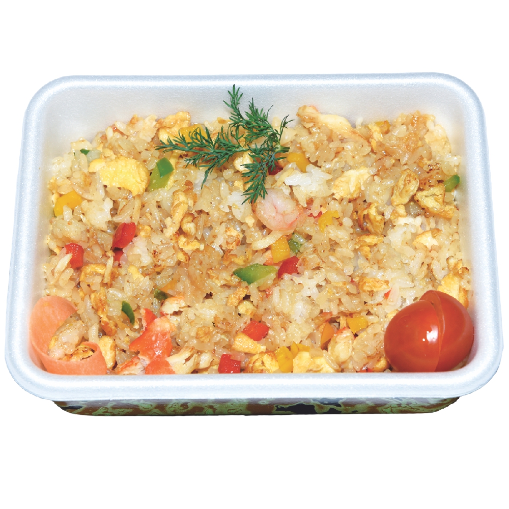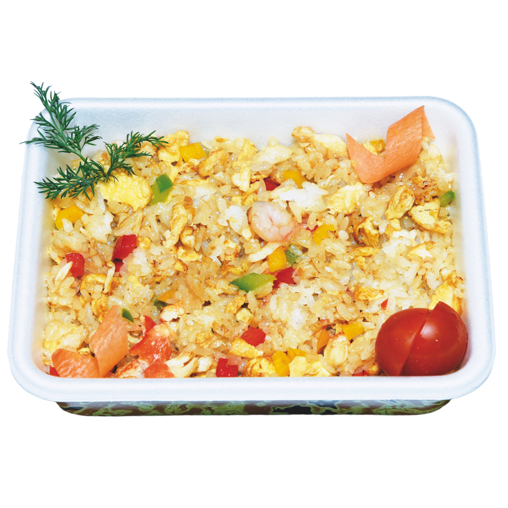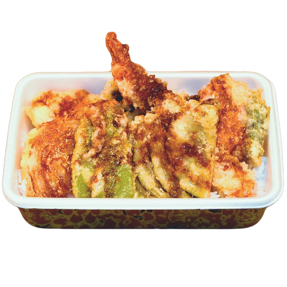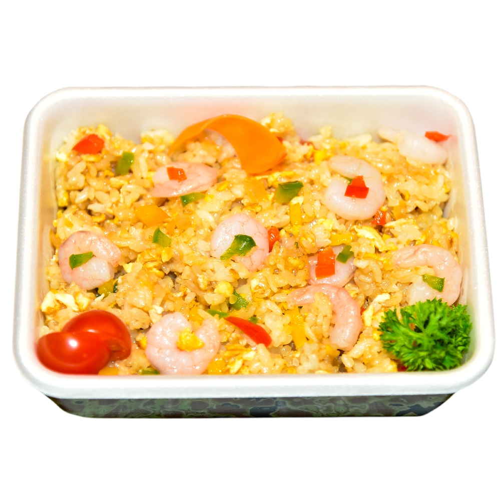 Креветки, обжаренные в японких сухарях, со сладким луком, грибами Шитаке и яйцом, выложенные на рис