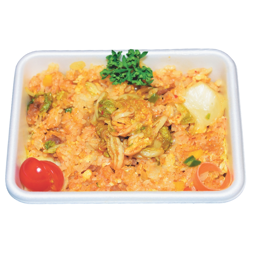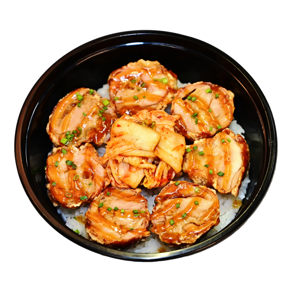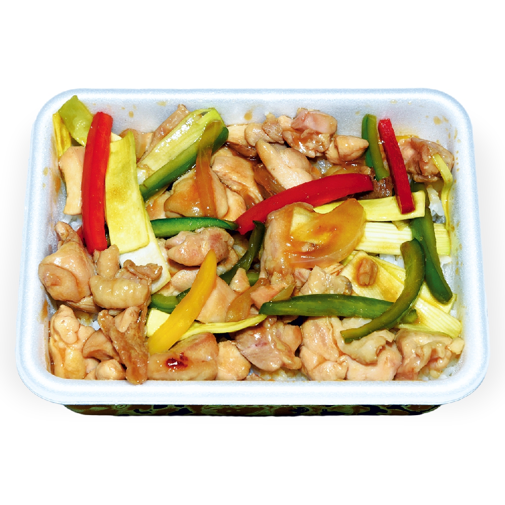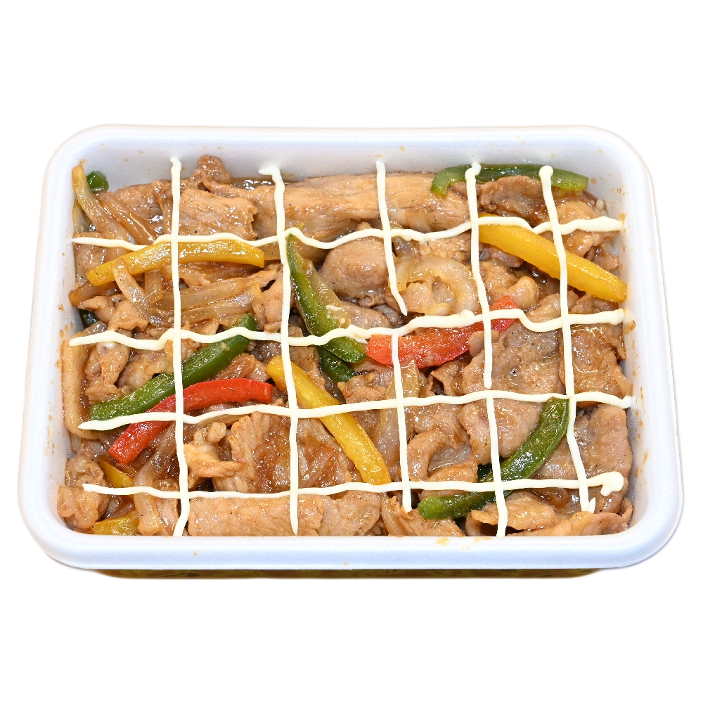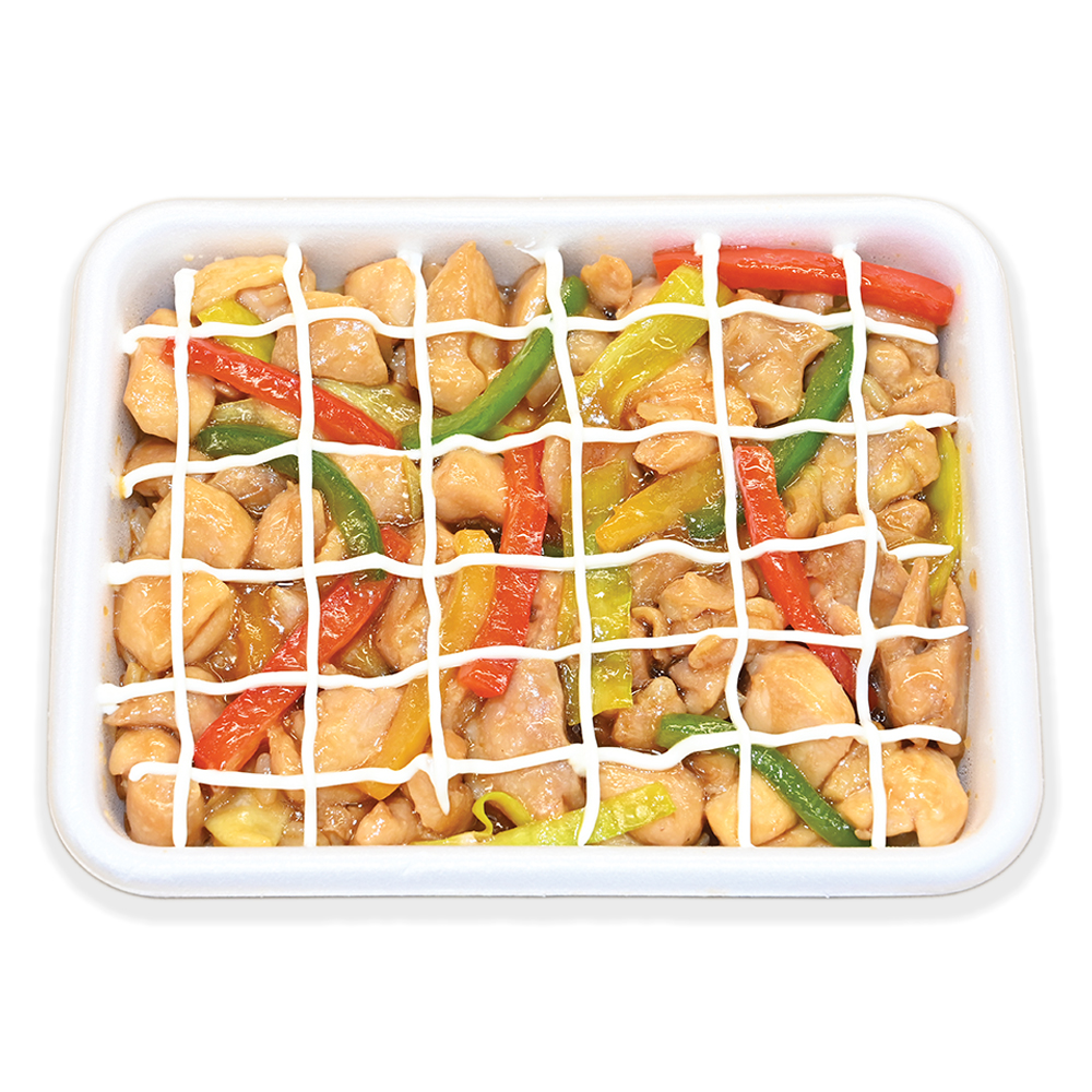 Кусочки свинины, обжаренные со сладким перцем и луком в специальном соусе, выложенные на рис, с майоннезом.
