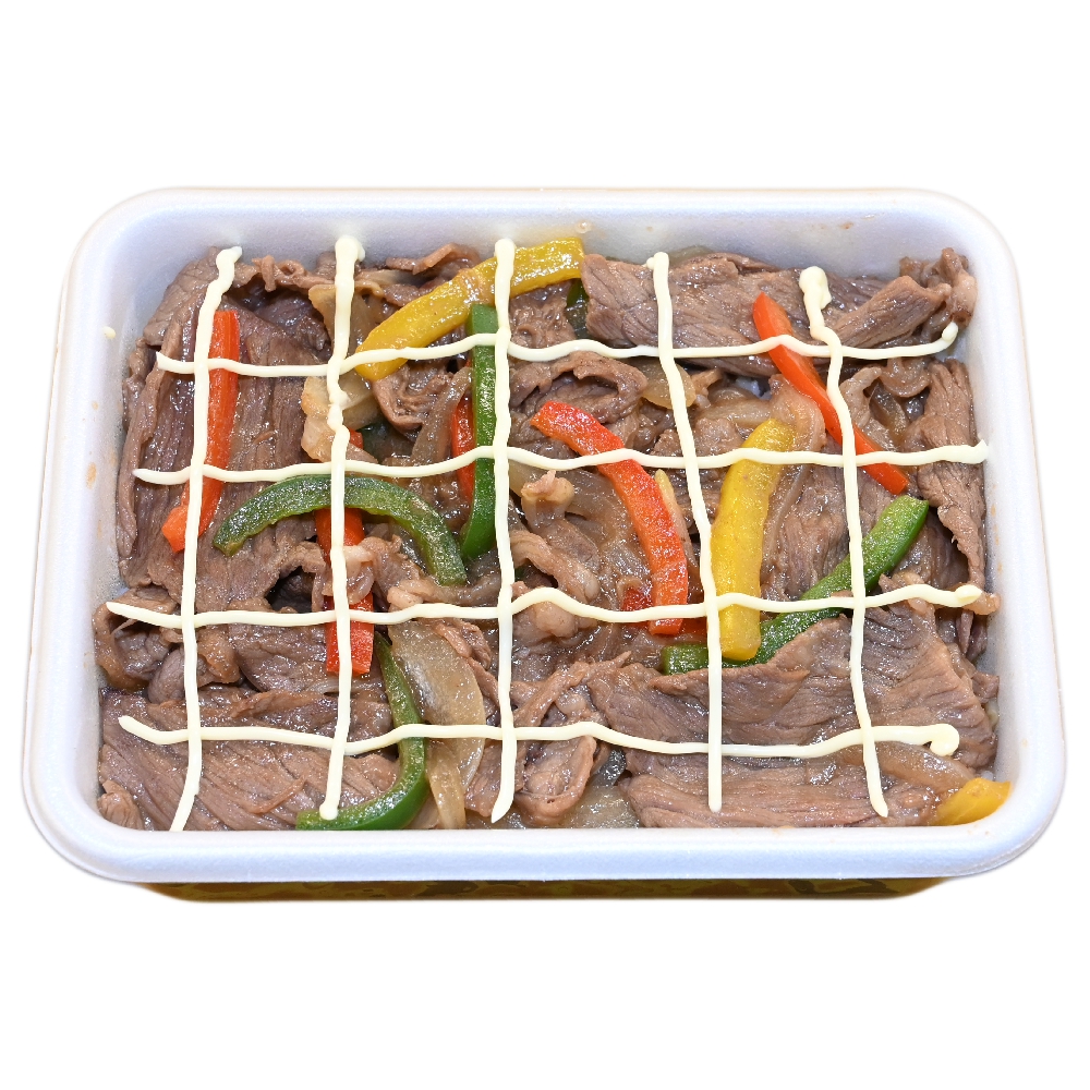 Говядина, обжаренная со сладким перцем и луком, выложенная на горячий рис, с майонезом.